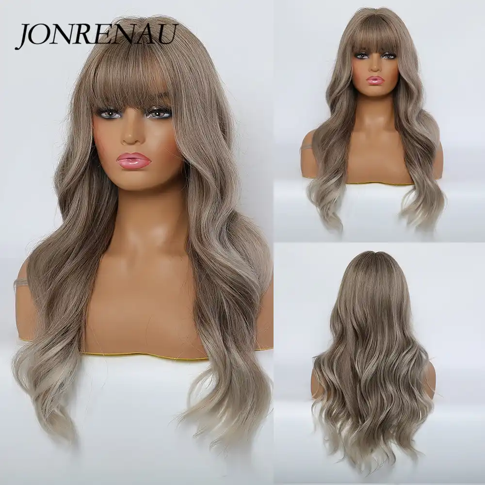 Jonrenau合成ライトブラウン色ハイライトナチュラルロング波かつら前髪